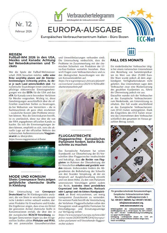 Sollte es zu Problemen bei Ihrem Einkauf kommen, ist das Europäische Verbraucherzentrum Italien für Sie da, um Ihre Rechte zu schützen! Wir bieten Ihnen kostenlose Unterstützung bei der Beilegung von Streitigkeiten mit Unternehmen mit Sitz in der EU, Island, Norwegen und dem Vereinigten Königreich. Kontaktieren Sie uns telefonisch unter 0471 980939 oder per E-Mail unter info@euroconsumatori.org.